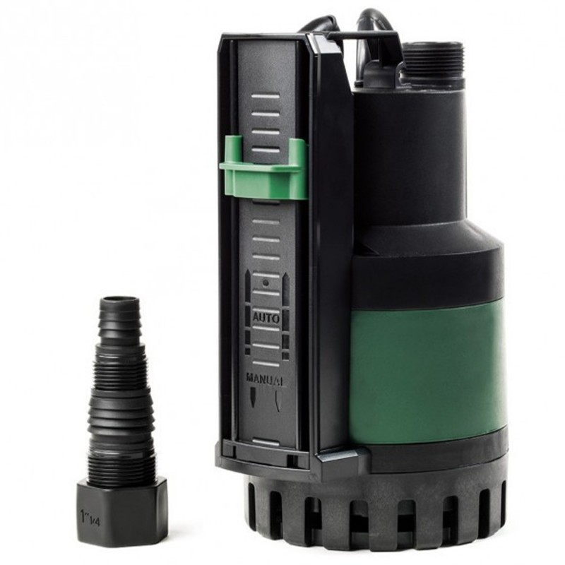 Pompe vide cave avec flotteur électronique et refoulement vertical réglable. Filtre amovible pour aspiration de particules jusqu'à 10 mm.