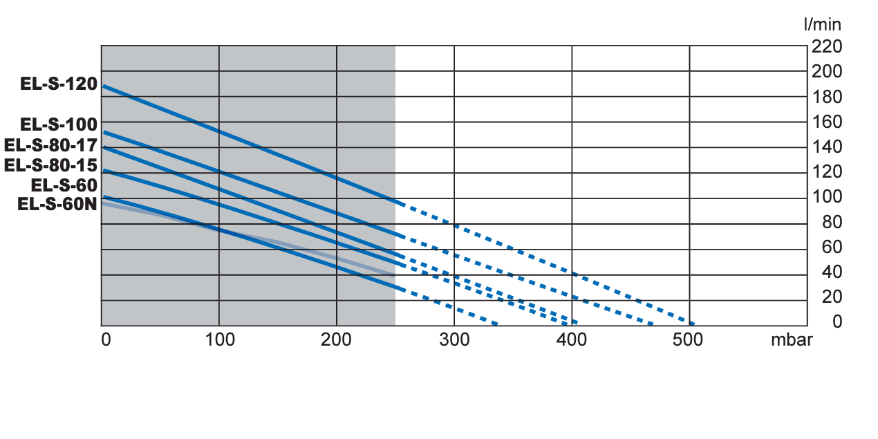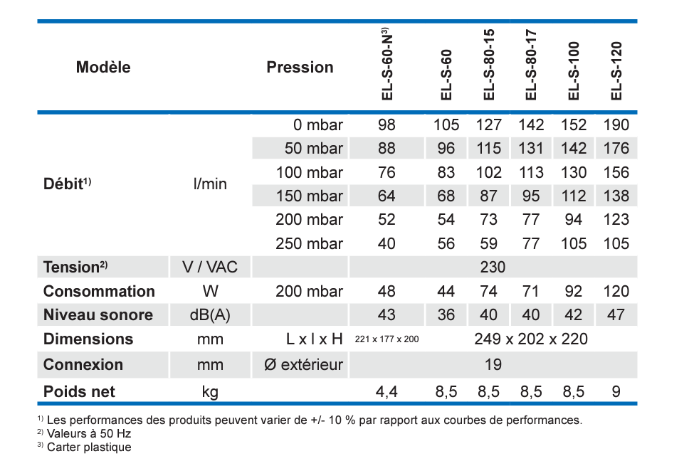 • Débit l/min 0 mbar 152 50 mbar 142 100 mbar 130 150 mbar 112 200 mbar 94 250 mbar 77