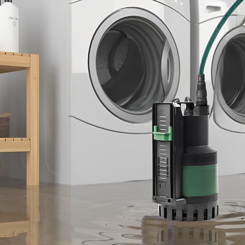 Pompe vide cave avec flotteur électronique et refoulement vertical réglable. Filtre amovible pour aspiration de particules jusqu'à 10 mm.
