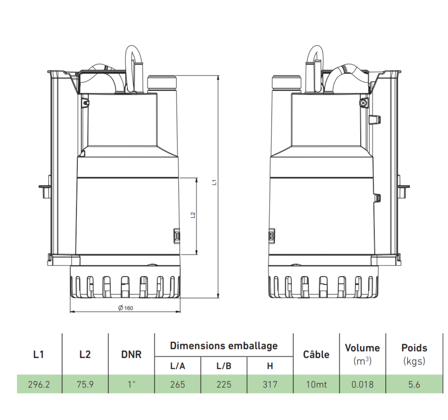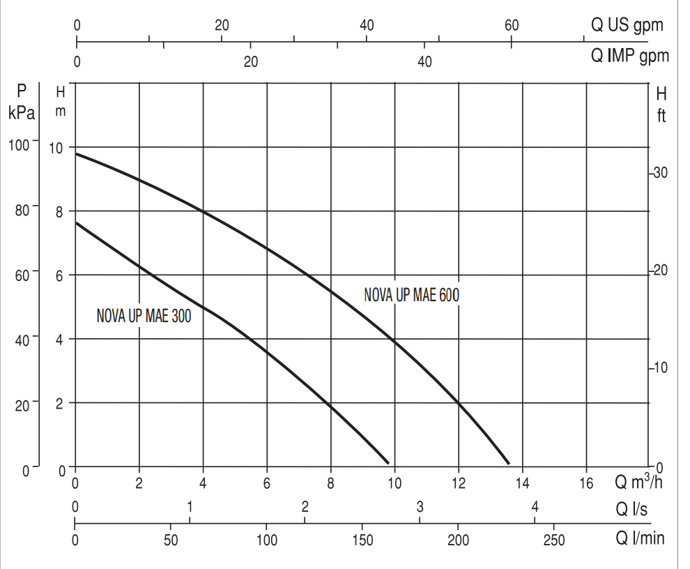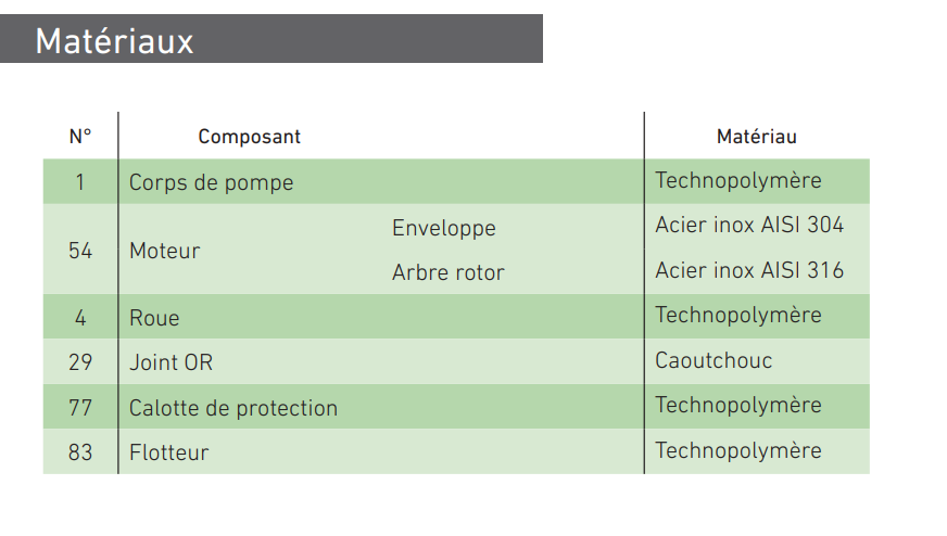 • Construction : Corps de pompe, roue, calotte et grille d'aspiration en technopolymère. Moteur, arbre de rotor et boulons et vis en acier inoxydable.